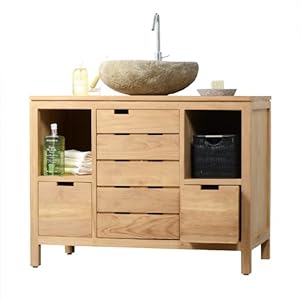Info: Eine Tür mit herausnehmbaren Einlegeboden (Innenmaße oben: H 24cm, Innenmaße unten: H 30cm beide 38cm Breite)/ zwei nach vorne offene Ablageflächen (B:25cm H: 30cm, T: 54cm)/ zwei Schubkästen auf Metallschienen mit jeweils den Innenmaßen 20x20 cm / keine Lochbohrung für Abfluß. So können Sie die Position des Waschbeckens individuell wählen/ Rückseite und Schubkästenböden aus Teak-MDF.