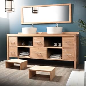 Info: 5 Schubkästen: B21 x H22 x P52 / 1 Schublade: B38 x H22 x T39 / 2 Ablagefächer oben: B43 x H24 x P57 / 2 Ablagefächer unten: B35 x H24 x T57 / 2 Tritte für Kinder B40 x H15 x T30 / Griffe aus Edelstahl / große Ablagefläche aus massivem Teak (2,5 cm Dicke) / durch die überstehende Ablagfläche hinten ergibt sich ein Abstand von ca. 5 cm, der Platz für Rohrleitungen lässt / Lieferung ohne Waschbecken und Armaturen.