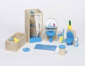 Badmöbel fürs Puppenhaus aus der Serie Junges Wohnen. Frischer Wind im Puppenhaus durch die moderne Möbelserie von goki mit vielen kleinen liebevollen Accessiores. Aus stabilem Holz gearbeitet und an Teilstellen farbig lackiert. Alle Teile sind liebevoll gearbeitet und mit vielen kleinen Details verschönert. 14 Teile aus Buchenholz,